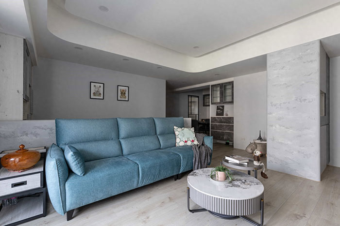 床尾设计了L型储物柜,提高收纳的同时也保留了采光窗,以细致的手法创造舒适氛围感。柜体局部做了陈列设计,避免单调。